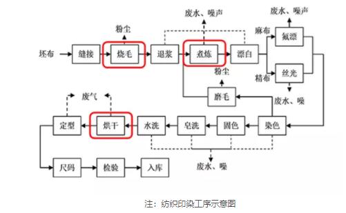 紡織印染的主要流程分為3步:前處理、染色印花、后收拾,其主要工序有燒毛、退漿、煮煉、漂白、絲光、定型、烘干和染色等。鍋爐是紡織生產線設備中的一員,用來帶動烘干等設備,并在壓片、燒毛、退煮漂、定型、染色等環節中供熱。
